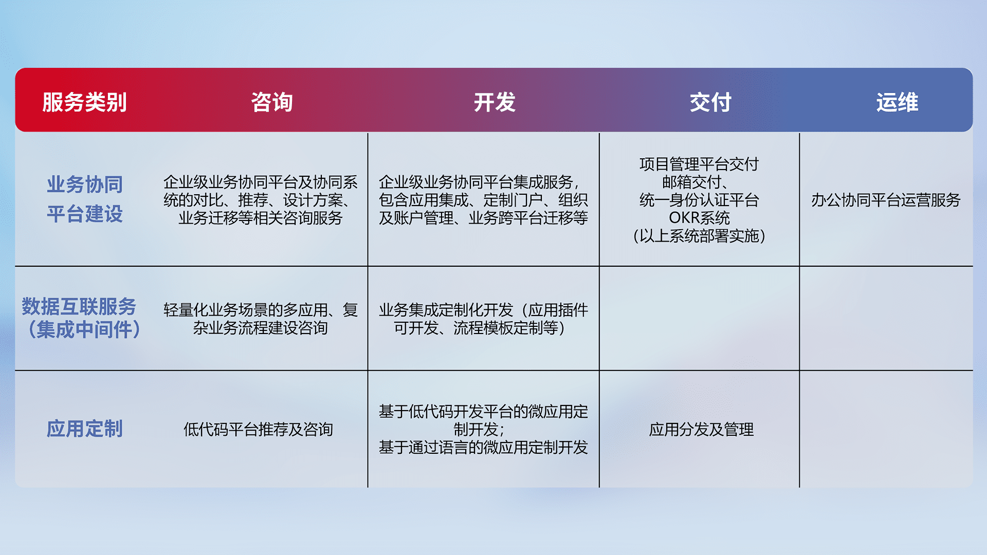 针对钉钉、、、、企微、、IDaas等平台级产品提供产品的规划、、方案、、交付、、、定制化开发等服务,,实现如统一协同办公、、智能客户服务、、混合会议管理、、、智能数据查询、、、、等业务场景,,实现数字化转型。。。。